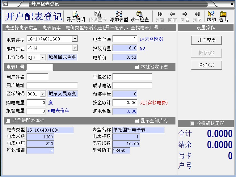 ,鼠標左鍵:“開戶配表登記”,出現(xiàn)以下對話框: