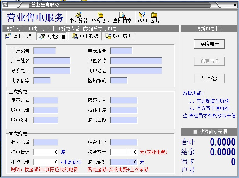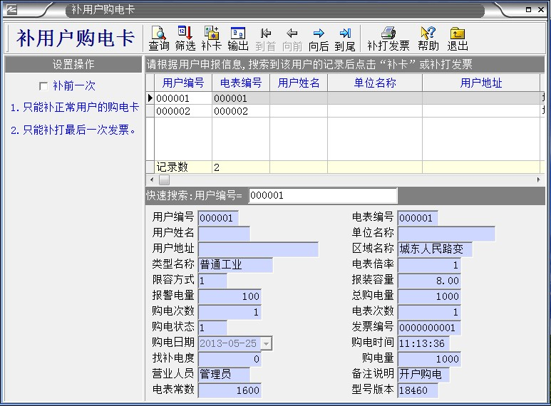 補卡操作完成后,請先將此卡插入被補卡的電表中,如電表顯示PO=**,表示補卡成功,這時才可以購電。