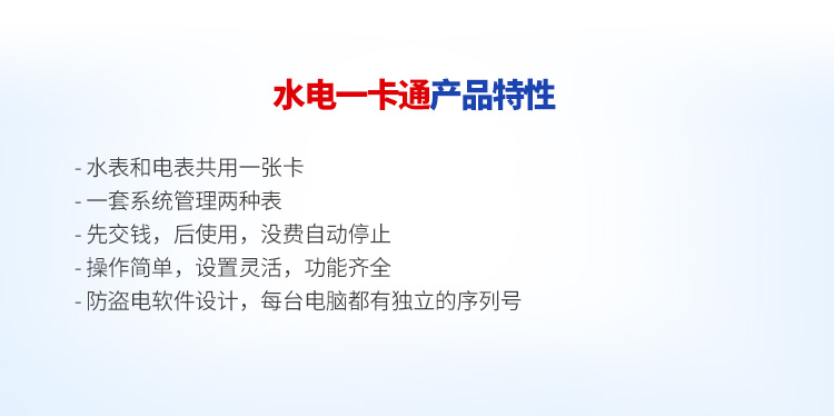 我公司生產(chǎn)的智能水表與電能表實(shí)現(xiàn)一卡通,用戶只需一張卡,即可同時(shí)管理家中所用的電表、水表。