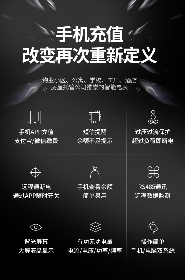 遠(yuǎn)程充值電表系統(tǒng)應(yīng)用小區(qū),寫字樓,工業(yè)園,公寓,出租房,工廠,員宿舍,超市,市場,商超等領(lǐng)域,改善現(xiàn)階段物業(yè)小區(qū)用電管理簡陋,落后,用電管理不僅關(guān)系物業(yè)的經(jīng)濟(jì) 效益,而且和企業(yè)的社會責(zé)任密切相關(guān)。
